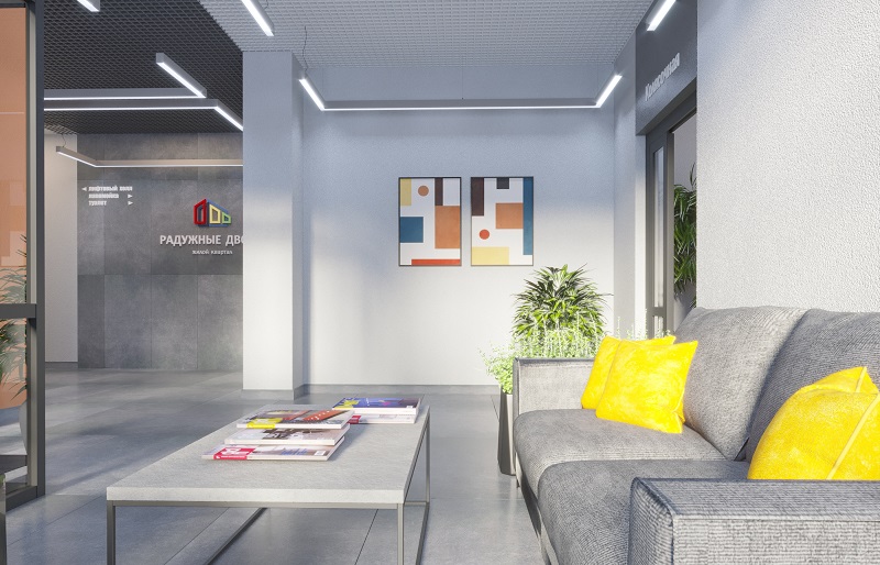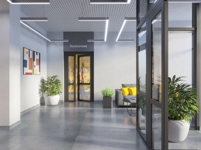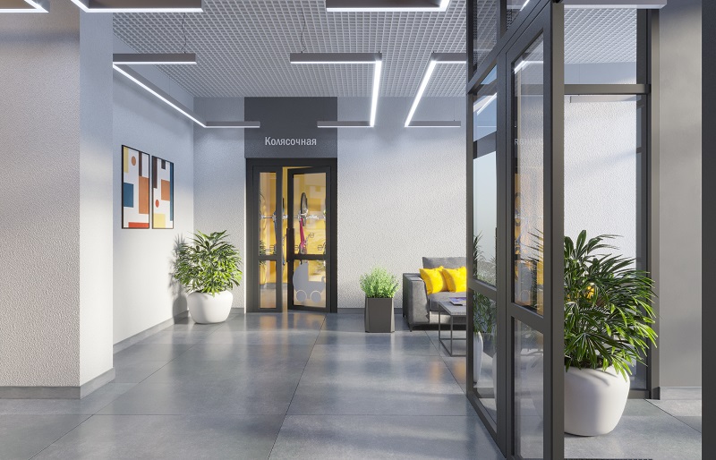 В 70-м строении специалисты «Термодома» предусмотрели отдельный вход в подъезд с уровня земли для мам с колясками. А выходов из колясочной два – во двор и в холл. Так возле лифтов всегда будет чисто, а мама достанет малыша и уложит его в коляску в удобном помещении. Также в холлах продуманы мягкие зоны ожидания и общие санузлы – так удобнее.