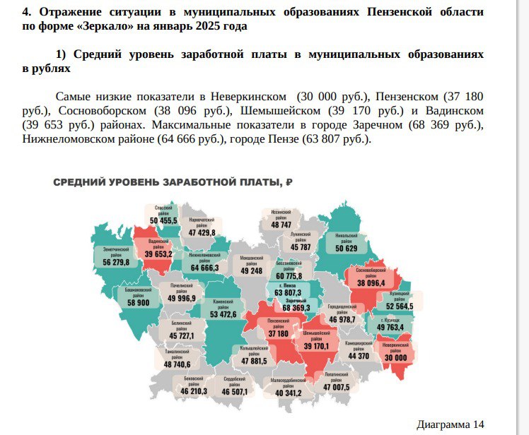 Согласно документу, разброс среднего уровня зарплат в районах области остается значительным. Более высокую заработную плату на январь 2025 года получали жители города Заречного – в среднем 68 369 рублей в месяц. Немного уступают Нижнеломовский район (64 666 рублей) и Пенза (63 807 рублей).