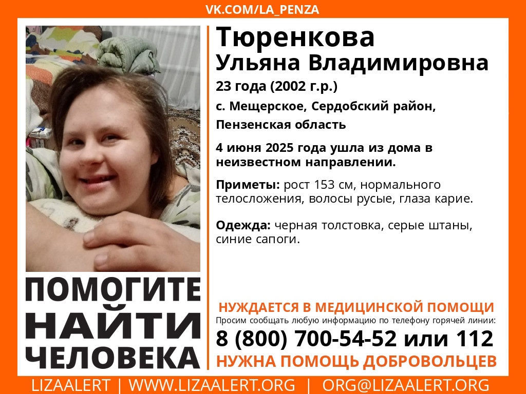 На следующий день, 4 июня, в селе Мещерское Сердобского района пропала 23-летняя Ульяна Тюренкова. Она также ушла из дома в неизвестном направлении. Молодая девушка нуждается в помощи медиков. Ее приметы: рост 153 см, нормальное телосложение, русые волосы и карие глаза. Была одета в черную толстовку.