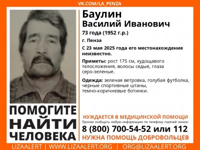 Так, 23 мая в неизвестном направлении ушел 73-летний Василий Баулин. Он проживал в городе Пензе. Волонтеры дали его приметы: рост 175 см, худощавое телосложение, седые волосы и серо-зеленые глаза. Добровольцы собирались на поиски мужчины на проспекте Строителей 26 мая, но так его и не нашли. Известно, что пензенец нуждается в медицинской помощи.