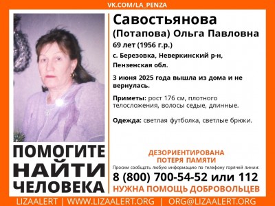 В скором времени, 3 июня, пропала 69-летняя Ольга Савостьянова (Потапова). Женщина вышла из дома, но назад так и не вернулась. Известно, что она была одета в светлые футболку и брюки. Проживала пенсионерка в селе Березовка Неверкинского района. Как отмечают волонтеры из поискового отряда «Лиза Алерт», она дезориентирована и страдает потерей памяти.