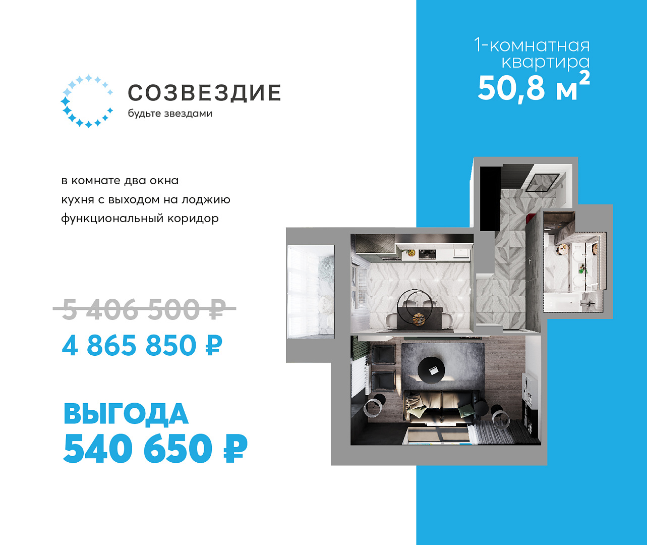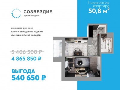 Квартира недели: 1-комнатная в «Созвездии» с выгодой 540 тыс. рублей