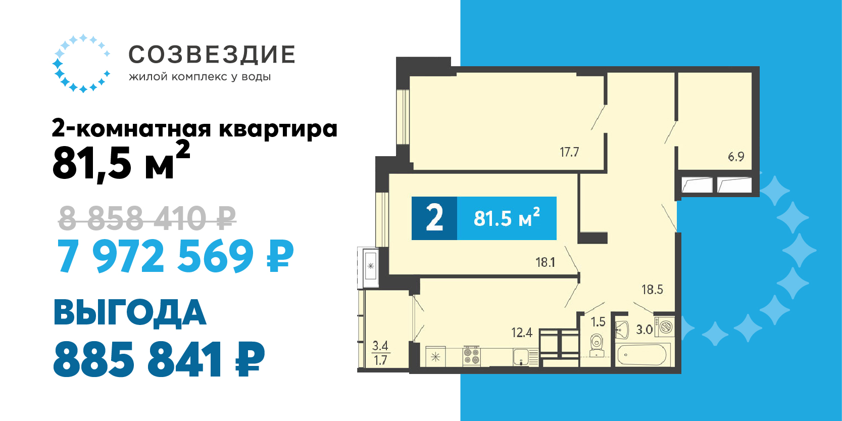 885 841 рубль — именно на такую выгоду может рассчитывать покупатель 2-комнатной квартиры в ЖК «Созвездие» от строительного холдинга «Термодом», но только на неделе с 12 по 18 января — в рамках акции «Время выгодных решений»!