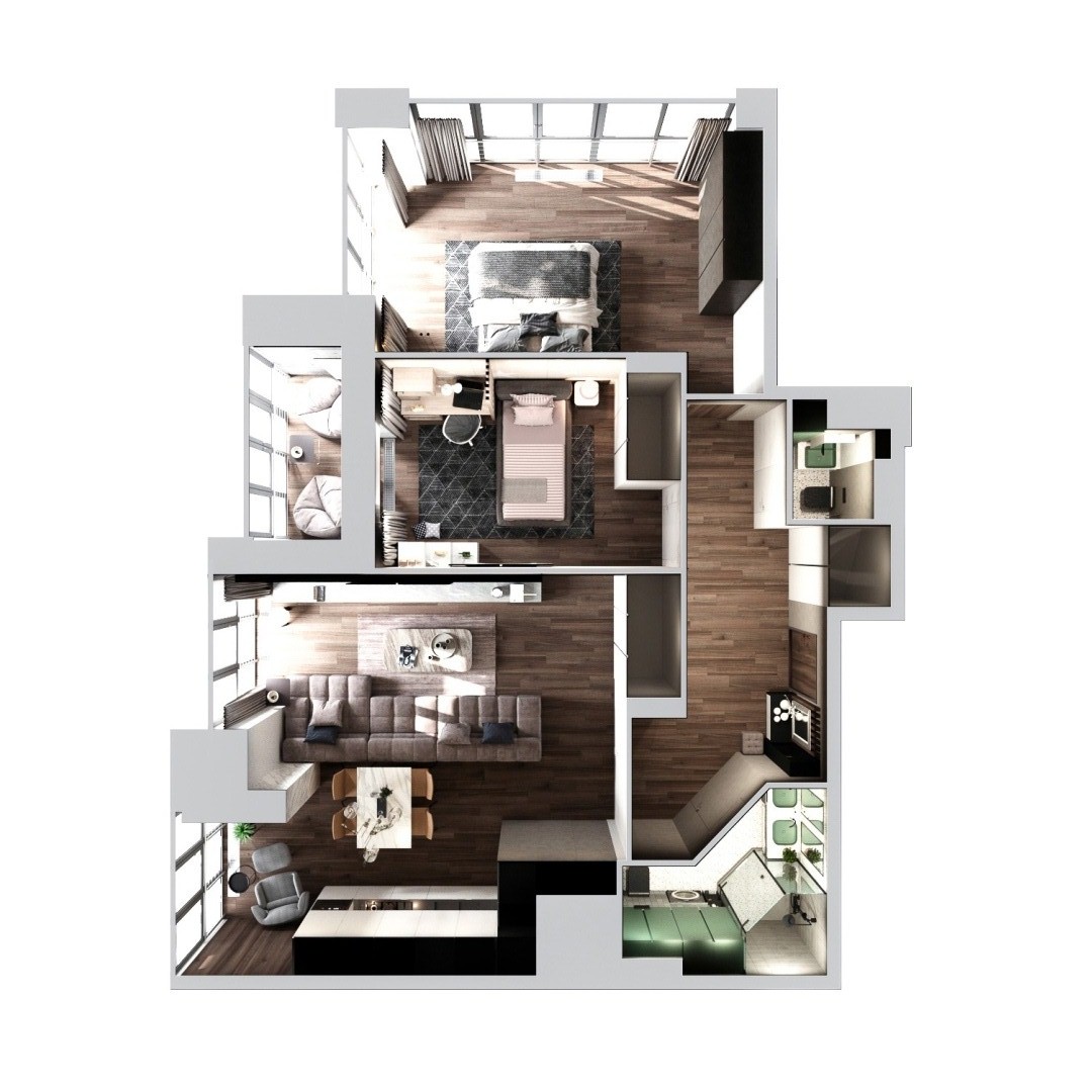 В этом ЖК у вас есть возможность грамотно зонировать каждый квадратный метр, создавая рациональный баланс между жилой и нежилой площадью. Планировки проектируются таким образом, чтобы вы смогли легко создать свой жизненный сценарий.