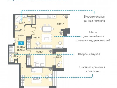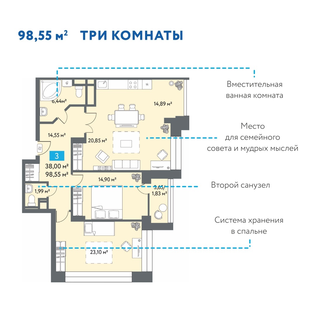 Хорошее решение для семьи – 3-комнатная в ЖК «Созвездие». В просторной (35,8 кв. м) кухне-гостиной дети будут играть в настолки, устраивать квизы, смотреть мультфильмы всей компанией. Вы это время сможете приготовить им что-то вкусненькое, приглядывая в это время за детьми.