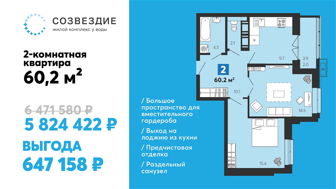 Классическая 2-комнатная квартира на неделе с 8 по 14 декабря участвует в акции «Время выгодных решений». А это значит, что только в эти дни приобрести квартиру мечты в топовом жилом комплексе «Созвездие» можно со скидкой в 647 158 рублей!