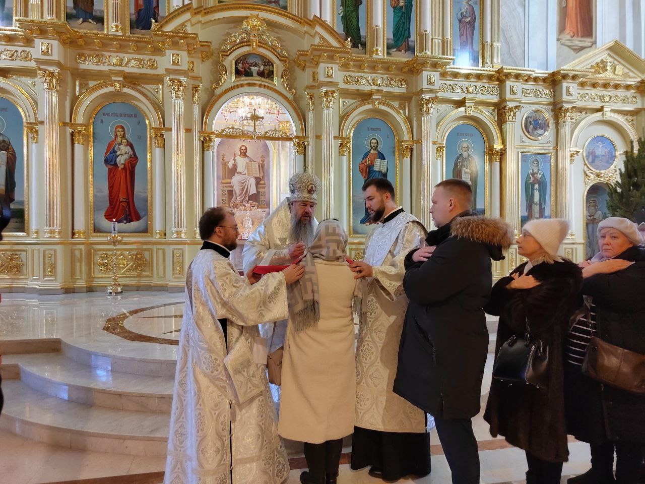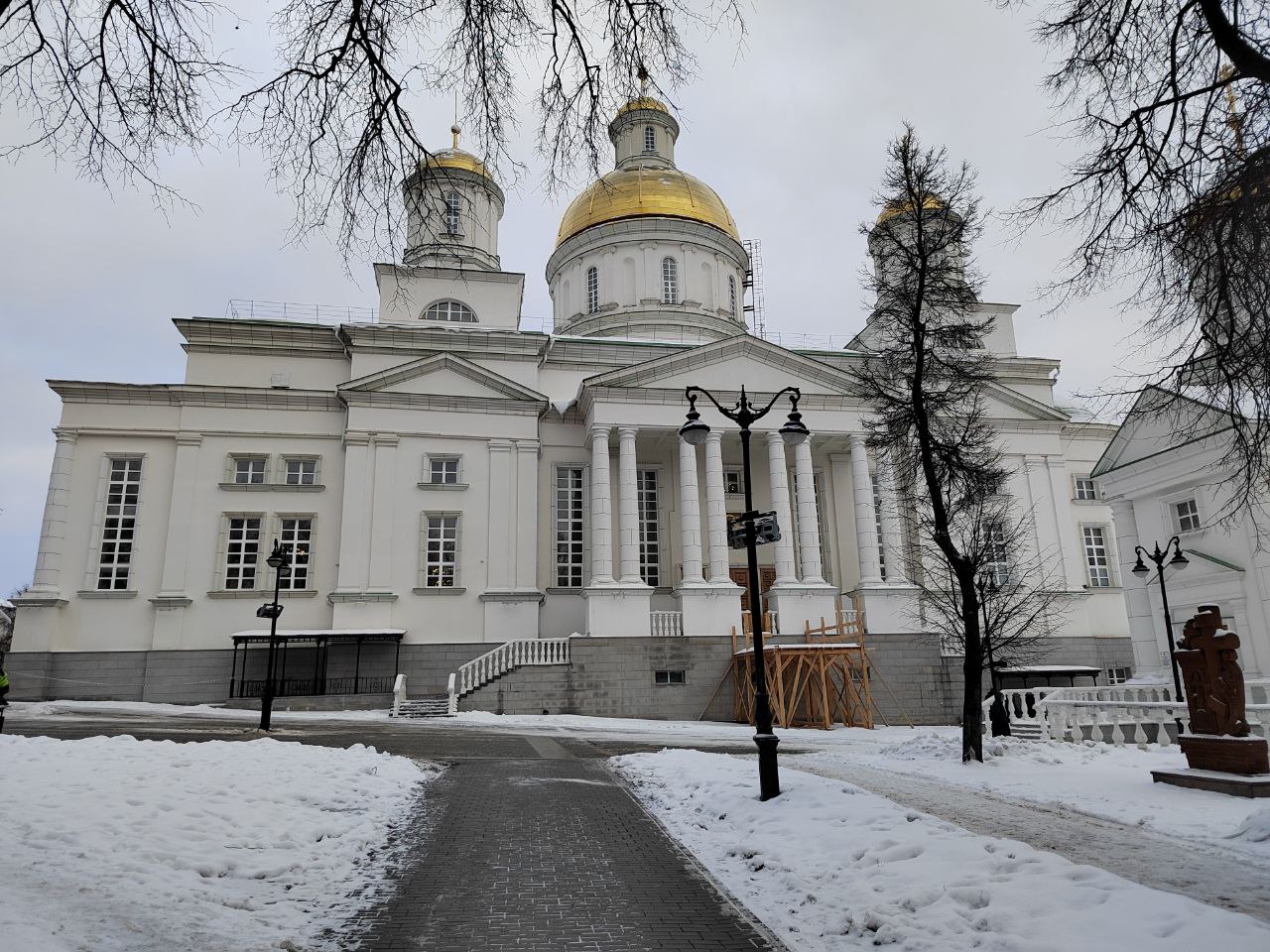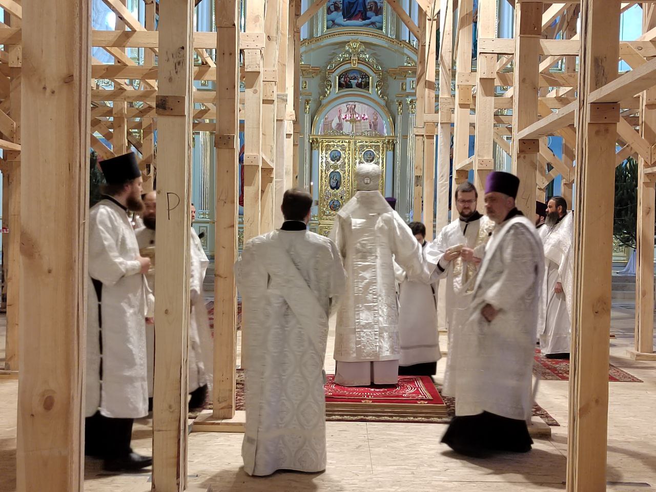 Спасский Кафедральный Собор приготовили к дальнейшей росписи: в центральном пределе храма установлены строительные леса, что нисколько не помешало участникам службы.