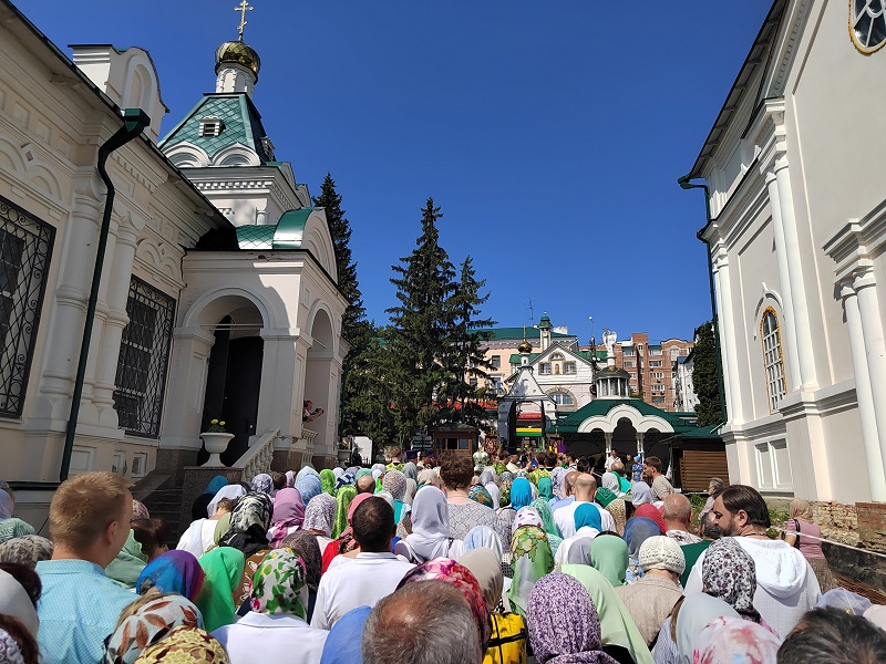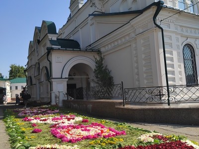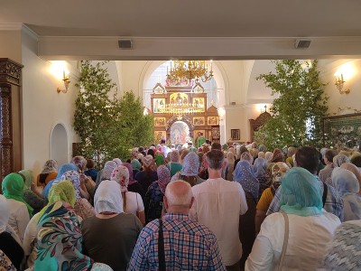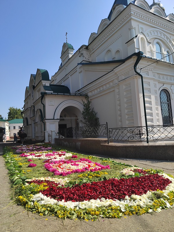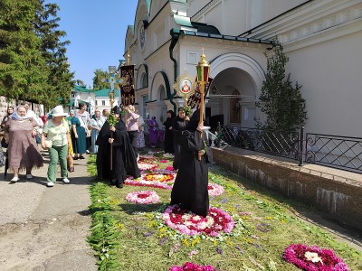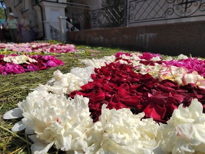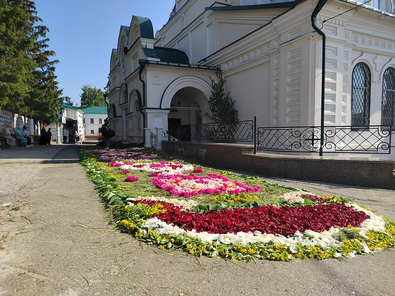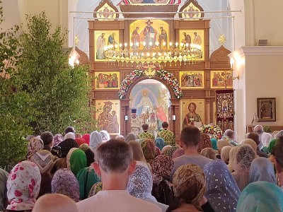 Дорога к храму была выстлана ковром из цветов и трав, вся церковь также благоухала цветочными ароматами, благодаря праздничному убранству. Прихожан собралось столько, что многие слушали службу во дворе храма.