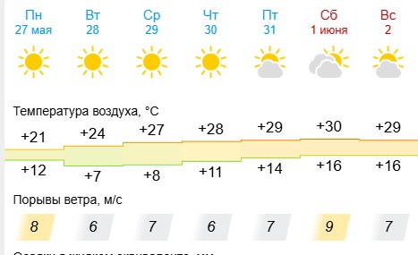 Сегодня, в понедельник, еще будет прохладно. Днем градусник покажет +21, но с завтрашнего дня значения начнутся повышаться. Во вторник прогнозируется до +24, в среду — до +27, а с четверга по воскресенье ожидается от +28 до +30 градусов.