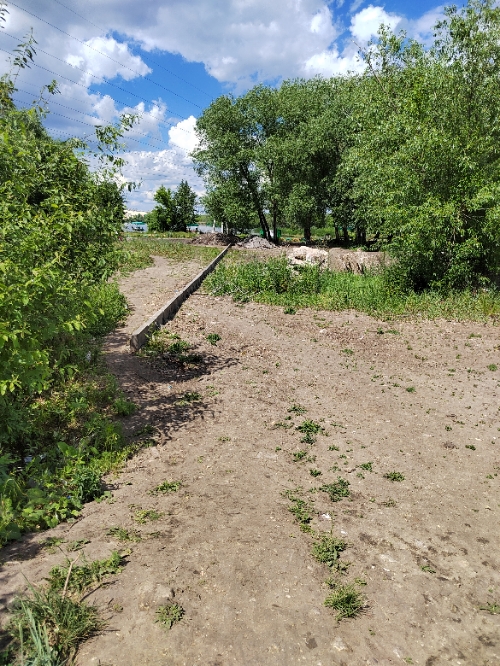 Пару недель назад рабочие выложили длинную линию из старых бордюров. На этом дело формирования пешеходного спуска заглохло. Рабочих и след простыл, а привезенный ещё в мае бордюрный камень б/у валяется, "радуя" окружающих.