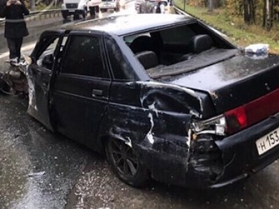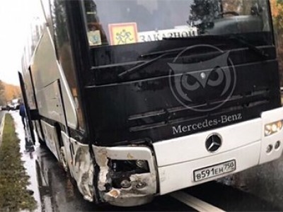 Отечественная легковушка ВАЗ-2110 врезалась в большой пассажирский автобус Mercedes-Benz c московскими номерами. Удар пришелся в правую переднюю фару, причем столкновение, судя по всему, было лобовым: Ладу разворотило, едва ли автомобиль подлежит восстановлению.