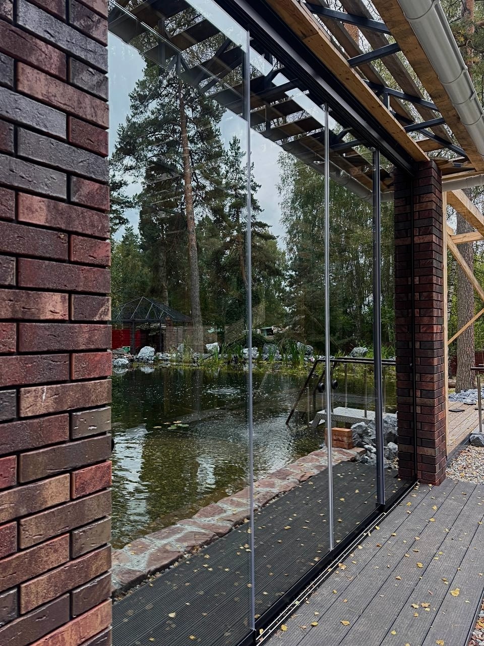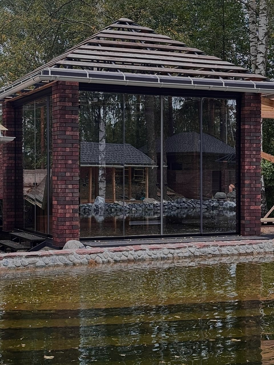 - Именно так. Отсутствие вертикальных стоек и перегородок в остеклении позволяет создать абсолютно панорамный обзор. Представьте: вы сидите в комфортной беседке, а перед вами открывается захватывающий вид на природу – будь то пруд, сад или лесной массив. В нашем проекте беседка стоит у воды, и ее отражение в пруду добавляет особую эстетику. Это создает невероятное ощущение присутствия, позволяет наслаждаться красотой окружающей среды в полной мере, при этом будучи защищенным от ветра, дождя и перепадов температур.