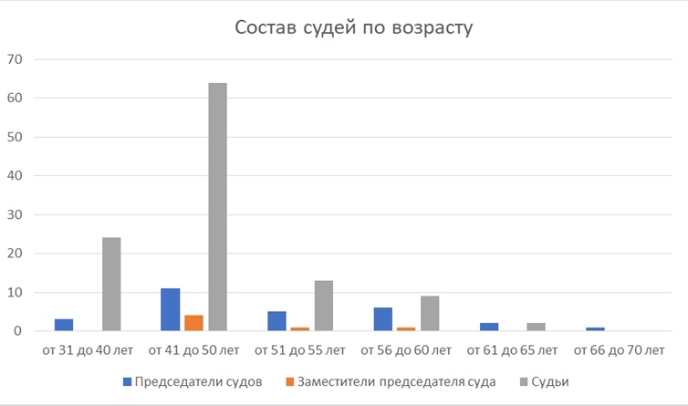 Большинство действующих судей (79 человек) находятся в возрасте от 41 до 50 лет. Более половины имеют стаж работы от 10 до 20 лет (55 человек), еще 43 судьи работают по профессии от 3 до 10 лет. В 2024 году из судебной системы ушли 9 судей, из которых только один достиг предельного возраста. Отмечается тенденция ухода из профессии судей в возрасте 45-55 лет.
