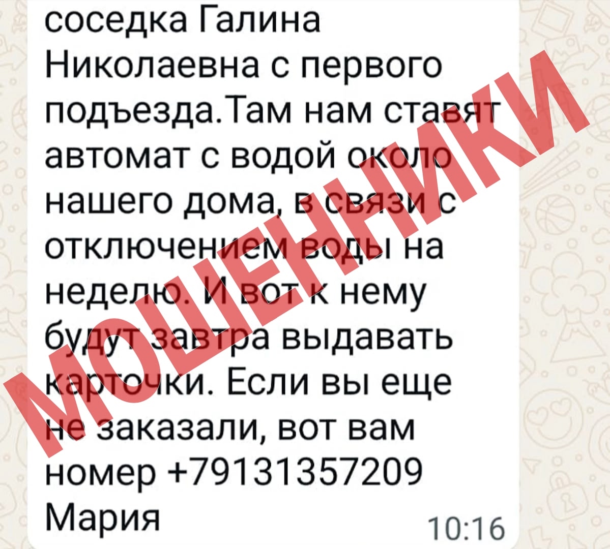 Администрация Никольского района предупреждает жителей о новой схеме мошенничества, связанной с якобы установкой автоматов с водой. Мошенники рассылают сообщения в мессенджерах о предстоящем отключении воды и предлагают установить у дома автомат с водой, чтобы обеспечить жителям доступ к ресурсу. Для получения карточки-ключа к автомату злоумышленники запрашивают личные данные или предлагают перейти по ссылкам, ведущим на фишинговые сайты.
