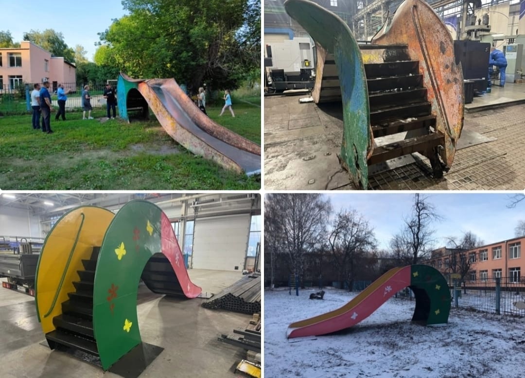 Олег Кочетков осмотрел поврежденную горку и поручил специалистам компании «СтанкоМашСтрой» вернуть конструкции первоначальный вид. Рабочие не только исправили дефекты, но также укрепили каркас горки и покрасили ее.