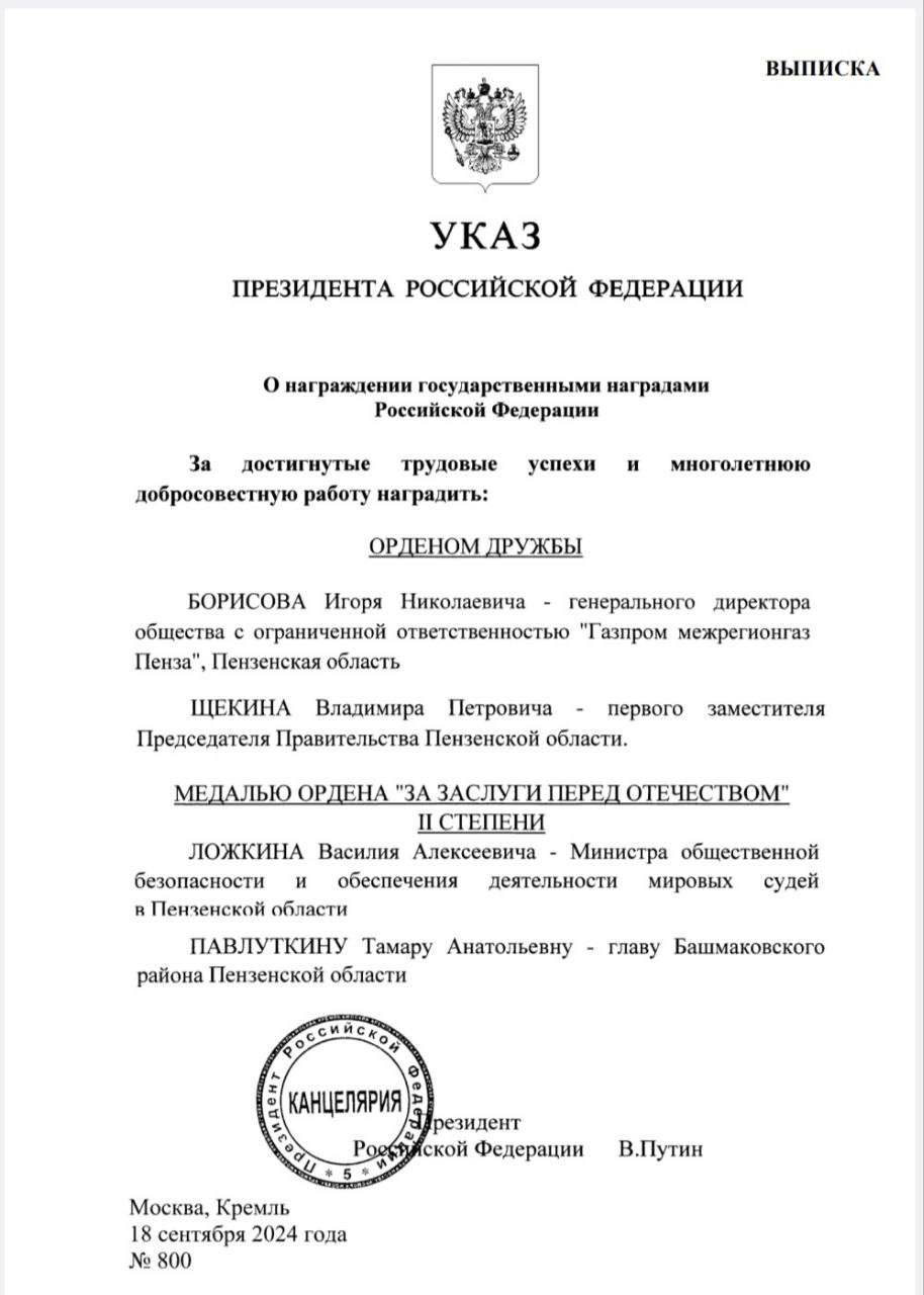 Так, Орденом Дружбы были награждены первый зампред правительства Пензенской области Владимир Щекин и генеральный директор компании «Газпром межрегионгаз Пенза».