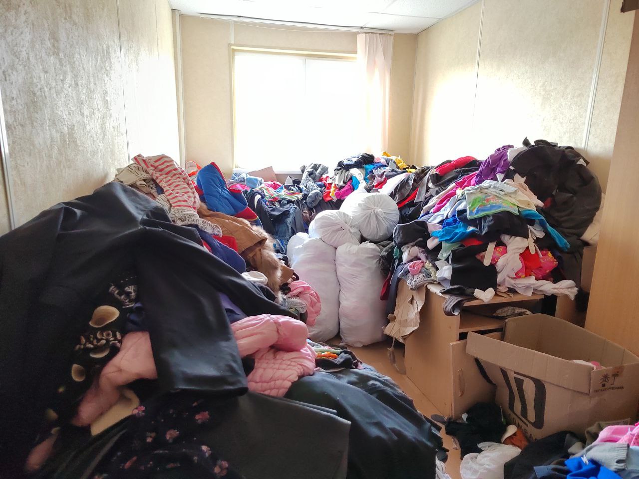 Представьте себе комнаты, до потолка заваленные вещами. Примерно так выглядит гуманитарка, доставленная в пункт эвакуации.
