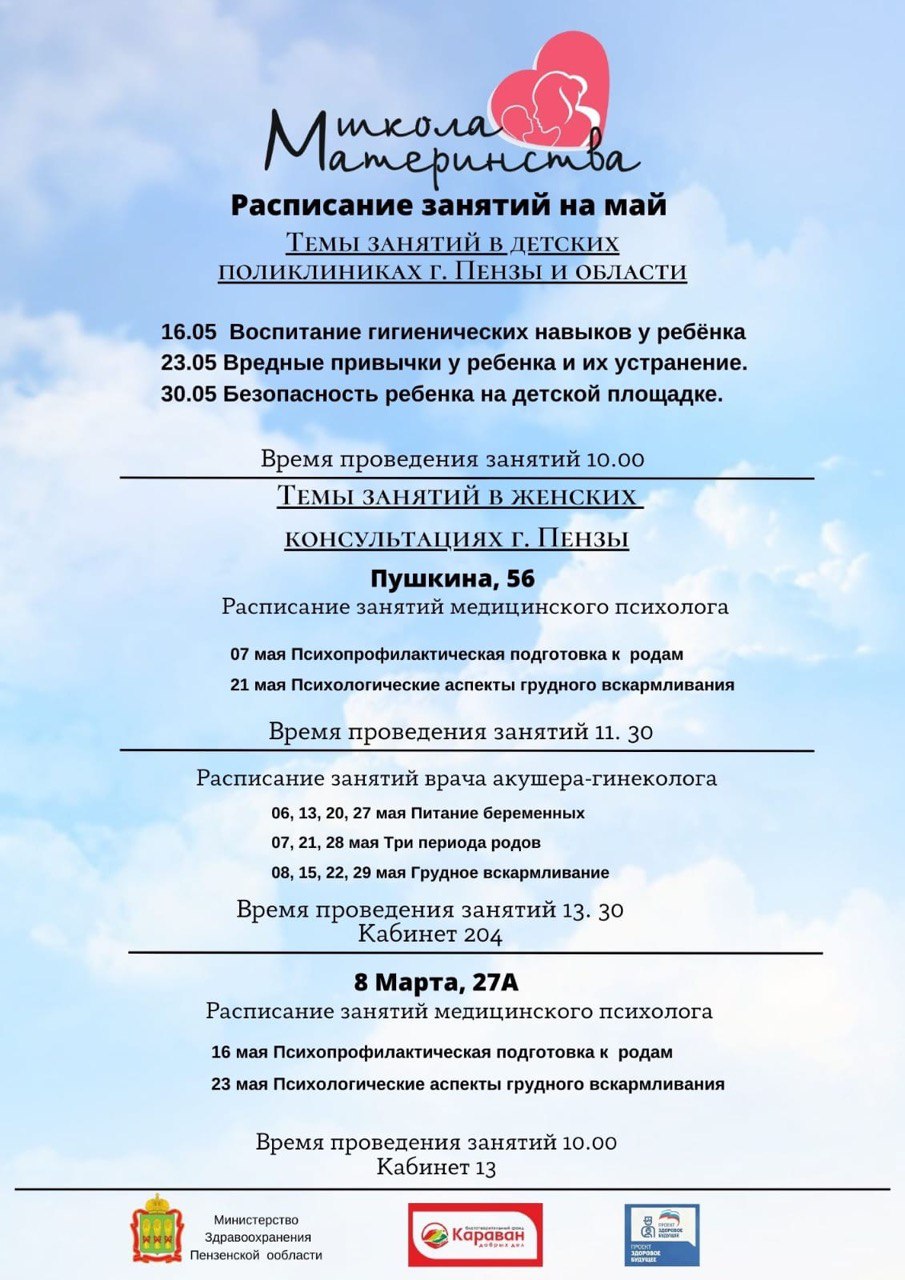 Депутат пензенского Законодательного собрания, руководитель благотворительного фонда «Караван добрых дел» Ольга Чистякова обнародовала расписание занятий в «Школе материнства» в мае 2024 года.