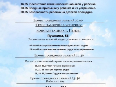 В женских консультациях состоятся встречи с медицинским психологом. По ул. Пушкина, 56, уроки пройдут 7 и 21 мая, по ул. 8 Марта, 27 «А» - 16 и 23 мая.