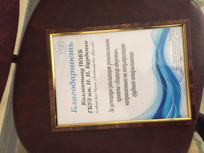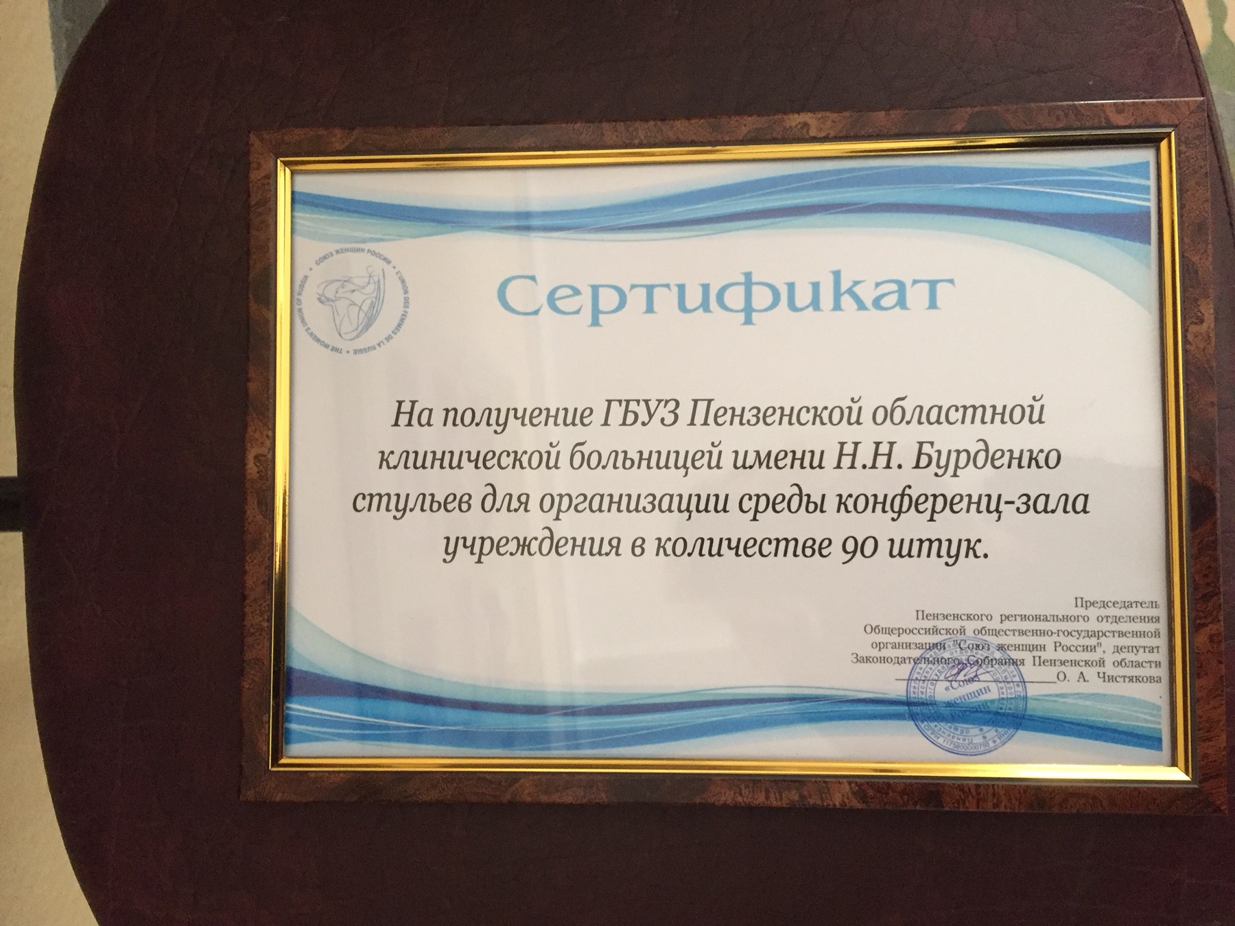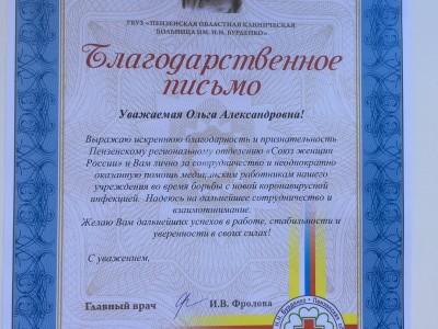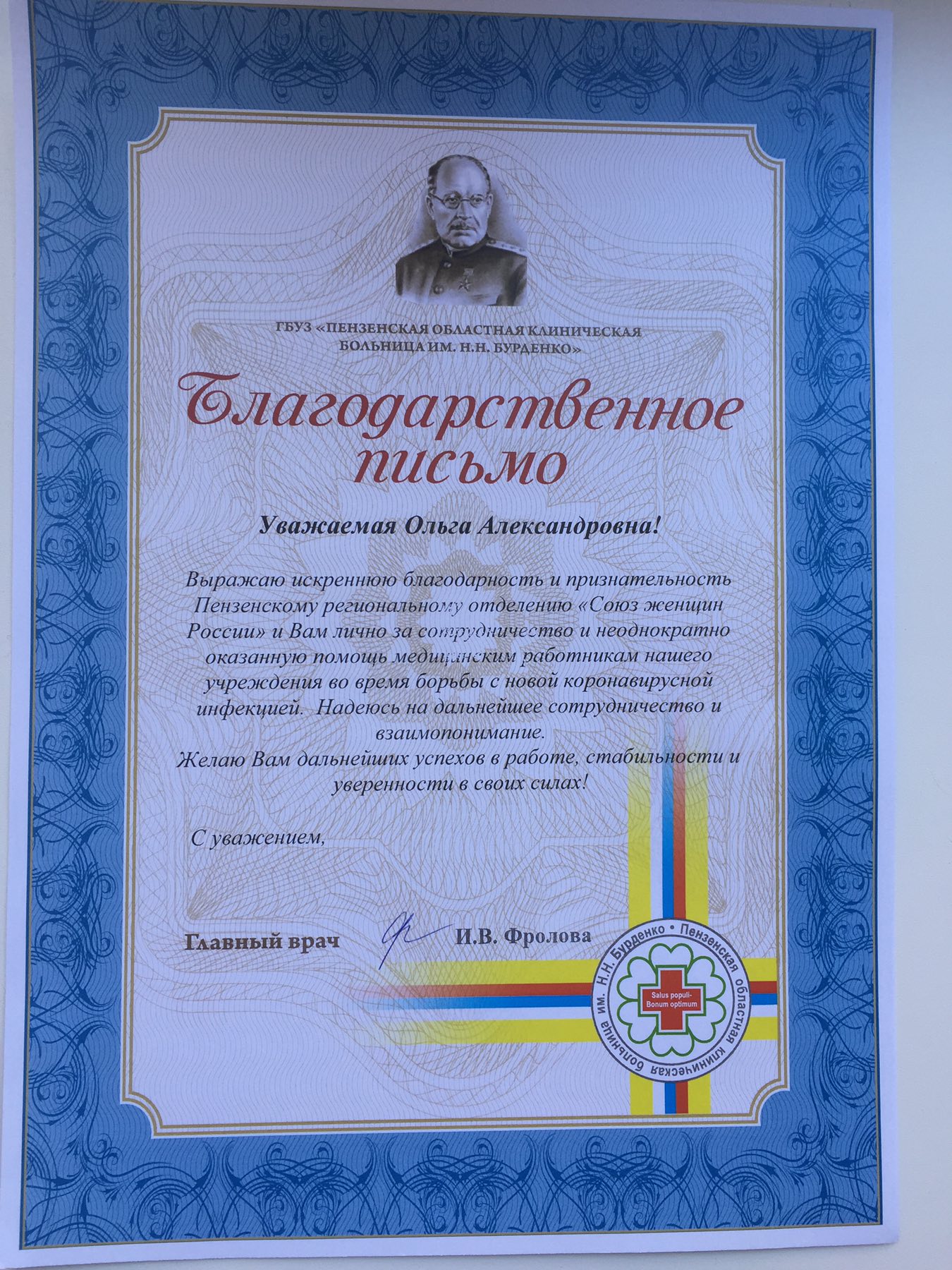 Главный врач больницы Бурденко Ирина Фролова влучила благотворительнице благодарственное письмо, отметив важность совместных проектов.