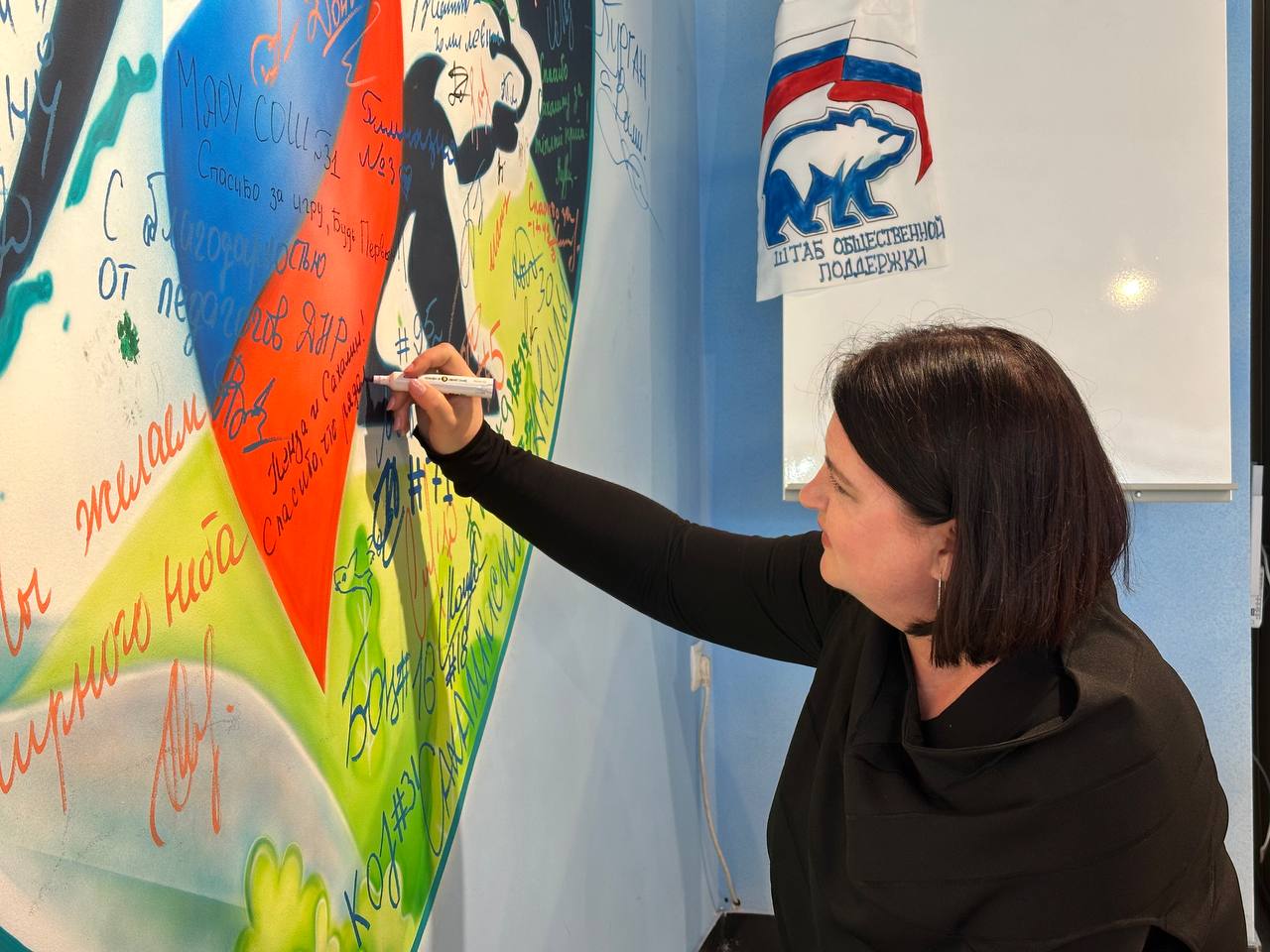 Она познакомилась с резидентами местного отделения ЕР и оставила пожелания на почетной стене - фишка сахалинского отделения.