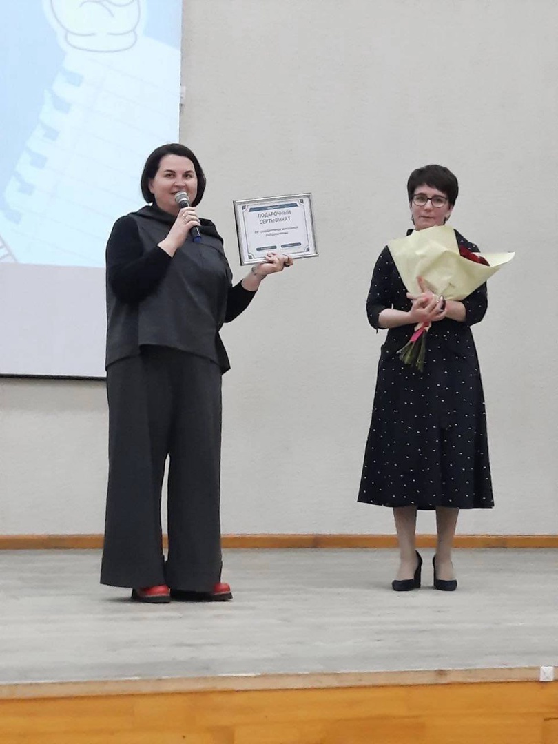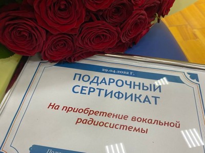 В честь праздника депутат вручила директору образовательной организации подарочный сертификат на приобретение вокальной радиосистемы.