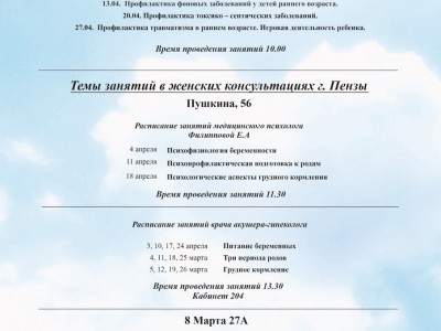 В этом месяце лучшие пензенские специалисты проведут уроки в женских консультациях, расположенных на улицах Пушкина, 56 и 8 Марта, 27 «А». Темами, с которыми познакомят будущих мам, станут: психофизиология беременности и подготовки к родам, психологические аспекты грудного кормления, а также профилактика послеродовой депрессии.