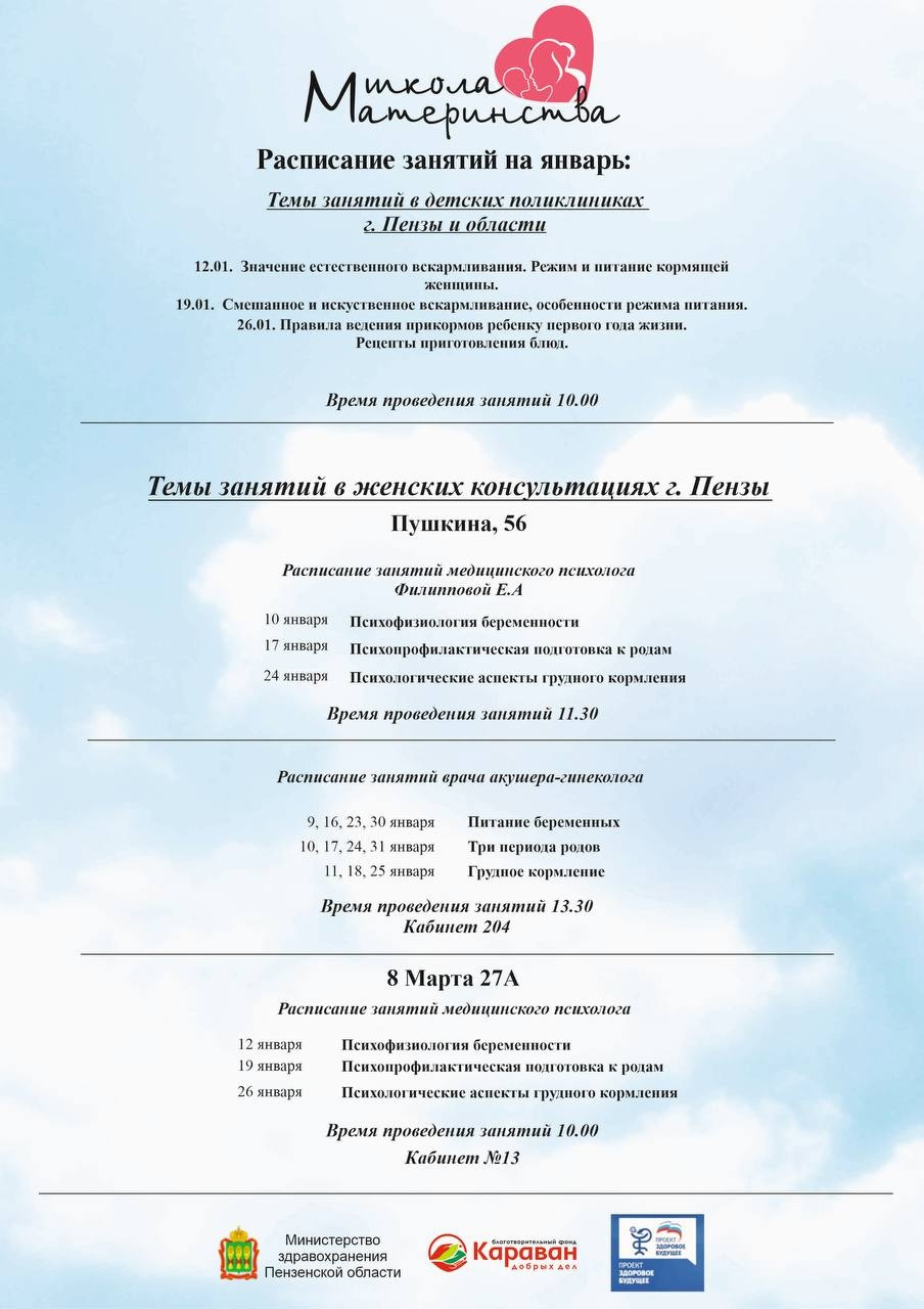 В детских поликлиниках уроки пройдут 12, 19 и 26 января. С пензячками разберут темы естественного вскармливания, режима и питания кормящей женщины. Также будут рассмотрены правила введения прикормов ребенку первого года жизни. Помимо этого медики поделятся правильными рецептами блюд для малышей.