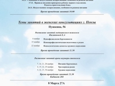 На улице Пушкина, 56 занятия пройдут 8, 15 и 22 ноября. На улице 8 Марта, 27 «А» – 10, 17 и 24 ноября. Акушер-гинеколог примет пензячек с понедельника по среду.
