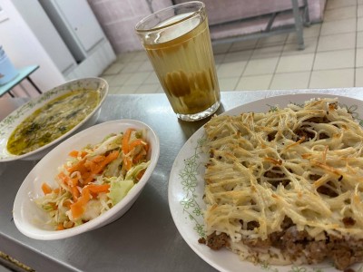 В тот день у ребят на обед была запеканка из мяса и макарон, овощной суп, салат из капусты и моркови и компот из кураги с витамином С.