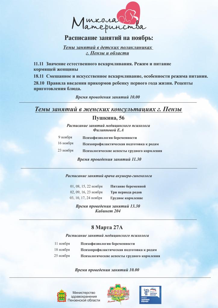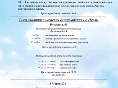 В ноябре занятия пройдут в женских консультациях Пензы, расположенных на улице Пушкина,56 и на улице 8 Марта, 27а.