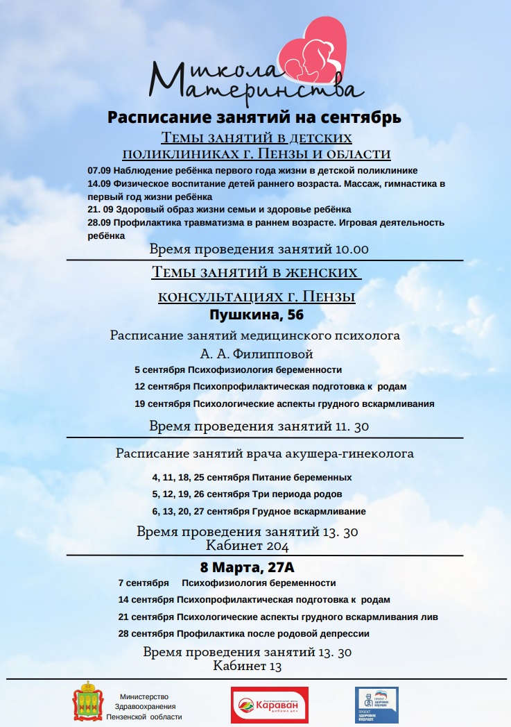 В детских поликлиниках уроки пройдут 7, 14, 21 и 28 сентября. В ходе них пензенцам расскажут о медицинском сопровождении ребенка, о массаже и гимнастике, а также о развитии малышей через игры.
