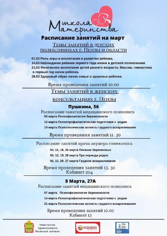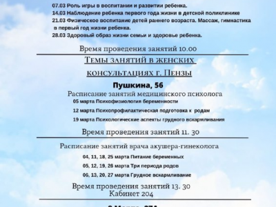 Также в этом месяце будут организованы встречи с медицинским психологом. Они пройдут в женских консультациях: на улице Пушкина, 56 – 5, 12 и 19 марта, на улице 8 Марта – 7, 14 и 21 числа.