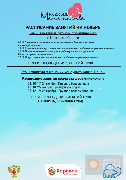 В ноябре в Пензе и Пензенской области продолжит работу проект «Школа материнства». Об этом сообщила депутат областного Законодательного собрания и руководитель благотворительного фонда «Караван добрых дел» Ольга Чистякова. Занятия, как и прежде, пройдут в детских поликлиниках и женских консультациях, где будущие и молодые родители смогут получить полезные знания и практические советы специалистов.