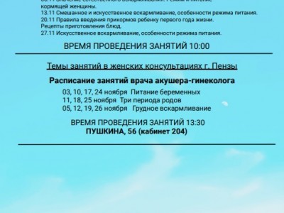 В женской консультации на улице Пушкина, 56 продолжатся лекции для будущих мам. По понедельникам – 3, 10, 17 и 24 ноября – врач акушер-гинеколог расскажет о питании беременных. По вторникам – 11, 18 и 25 ноября – будут рассмотрены три периода родов, а по средам – 5, 12, 19 и 26 ноября – тема грудного вскармливания. Все встречи пройдут в кабинете №204, начало в 13:30.