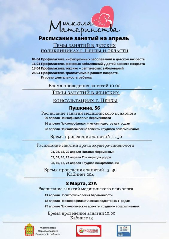 Запланировано, что психолог расскажет пензячкам о психофизиологии беременности, подготовке к родам и психологических аспектах грудного вскармливания. Акушер поднимет темы питания беременных, трех периодах родов.
