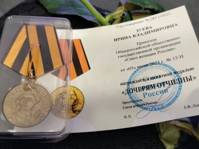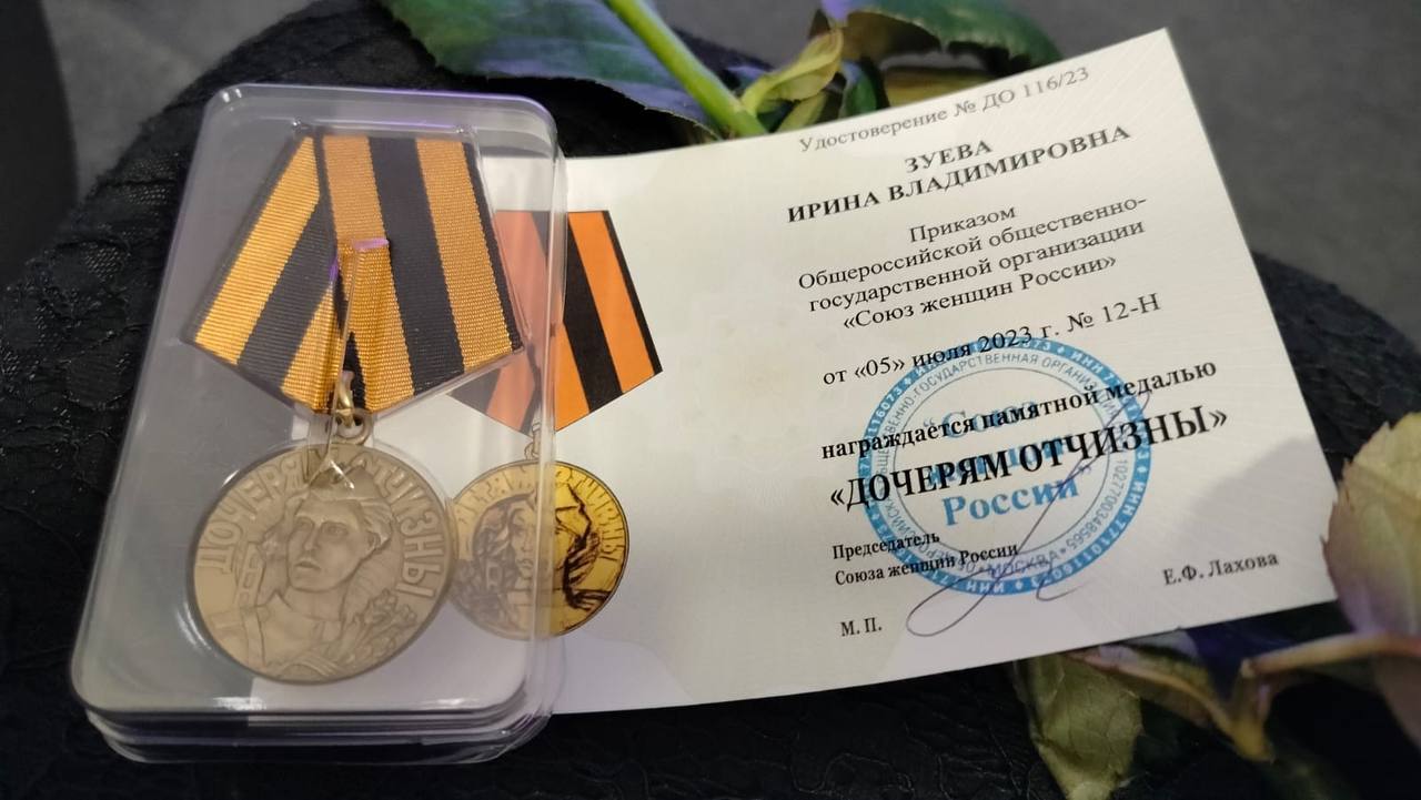 За большой личный вклад в оказание помощи бойцам в зоне СВО Ирина Зуева и Людмила Семененко награждены почетной медалью Союза женщин России «Дочерям Отчизны».