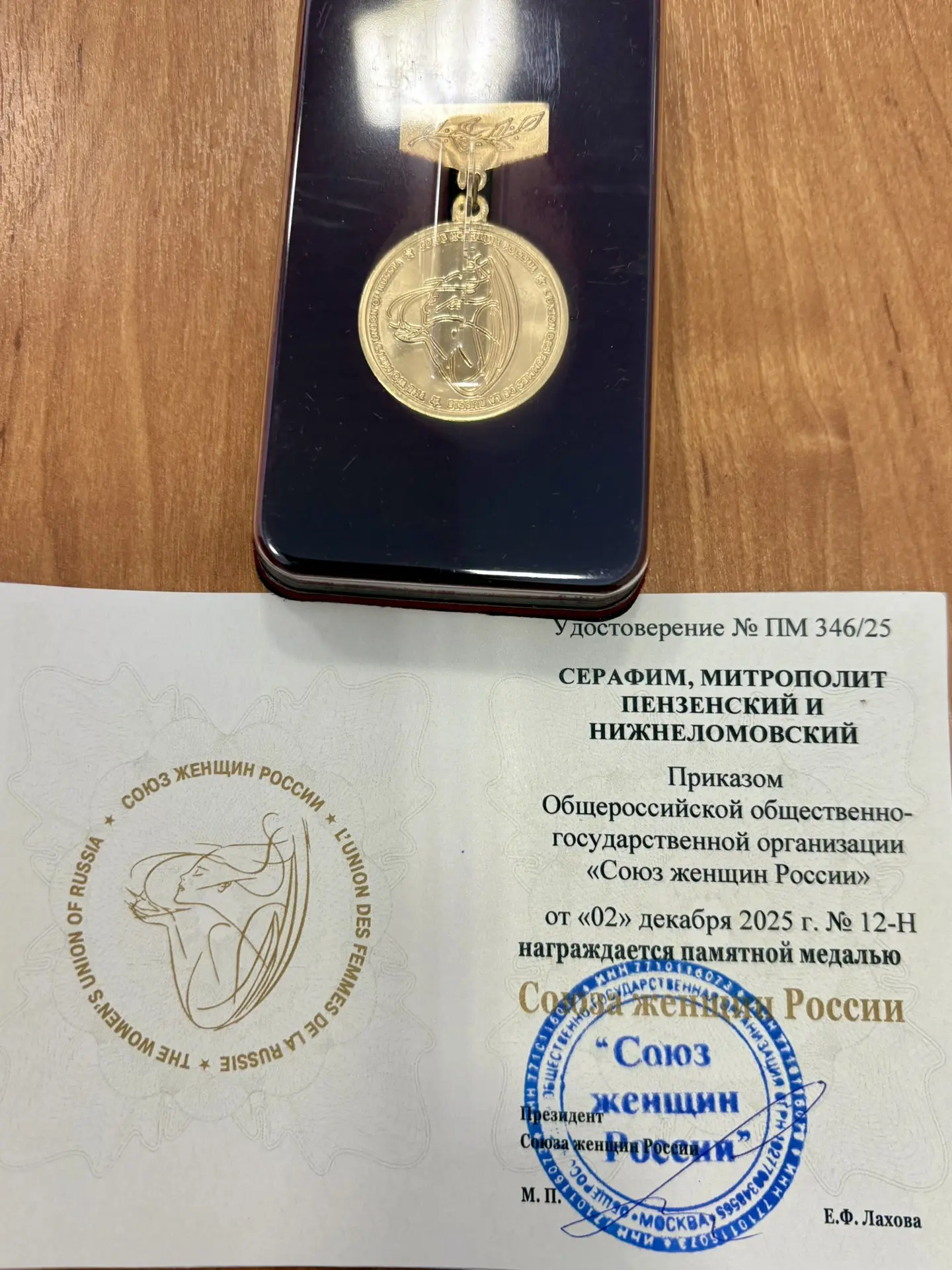 Лидер регионального отделения Союза женщин России (СЖР), депутат Законодательного Собрания Ольга Чистякова вручила митрополиту Пензенскому и Нижнеломовскому Серафиму памятную медаль СЖР. Эта награда стала благодарностью за многолетнюю поддержку и сотрудничество епархии с женским движением региона.