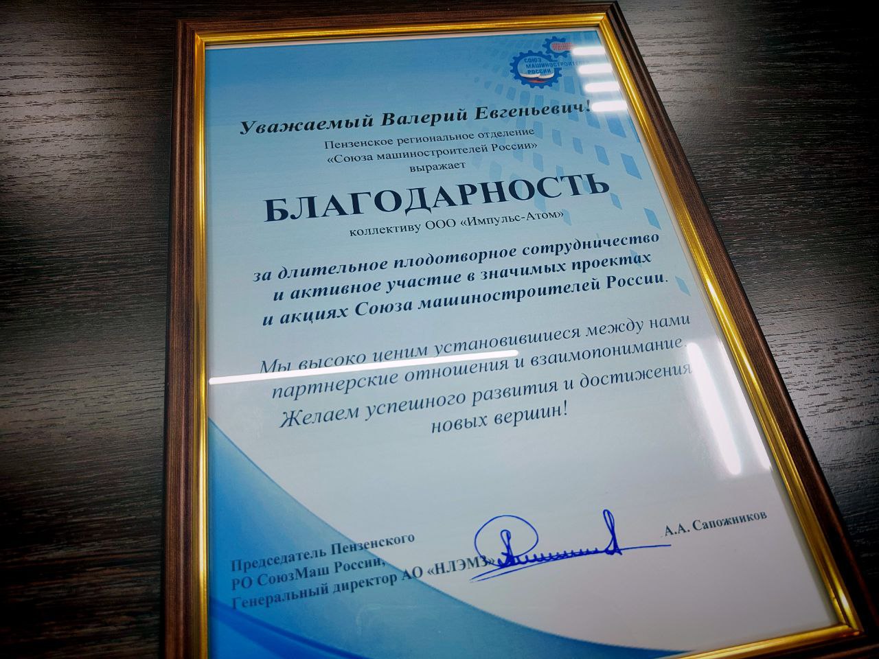 В рамках церемонии также был отмечен заместитель генерального директора пензенского машиностроительного завода «Импульс-Атом» Николай Меланин, который также получил Благодарность за активную совместную работу с СоюзМаш.