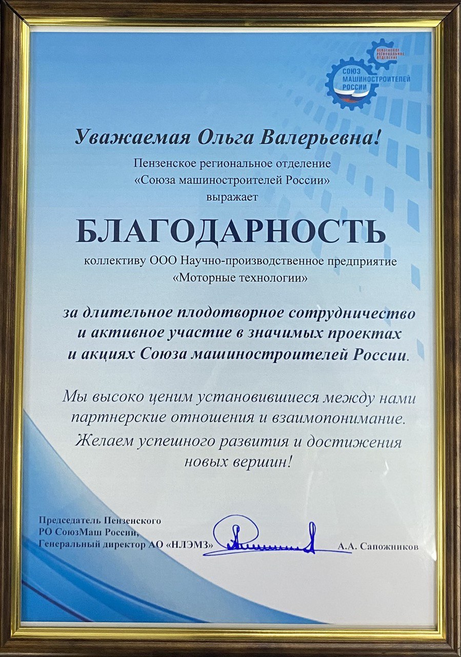 Как сказано в тексте, награда присуждена «за длительное плодотворное сотрудничество и активное участие в значимых проектах и акциях Союза машиностроителей России».