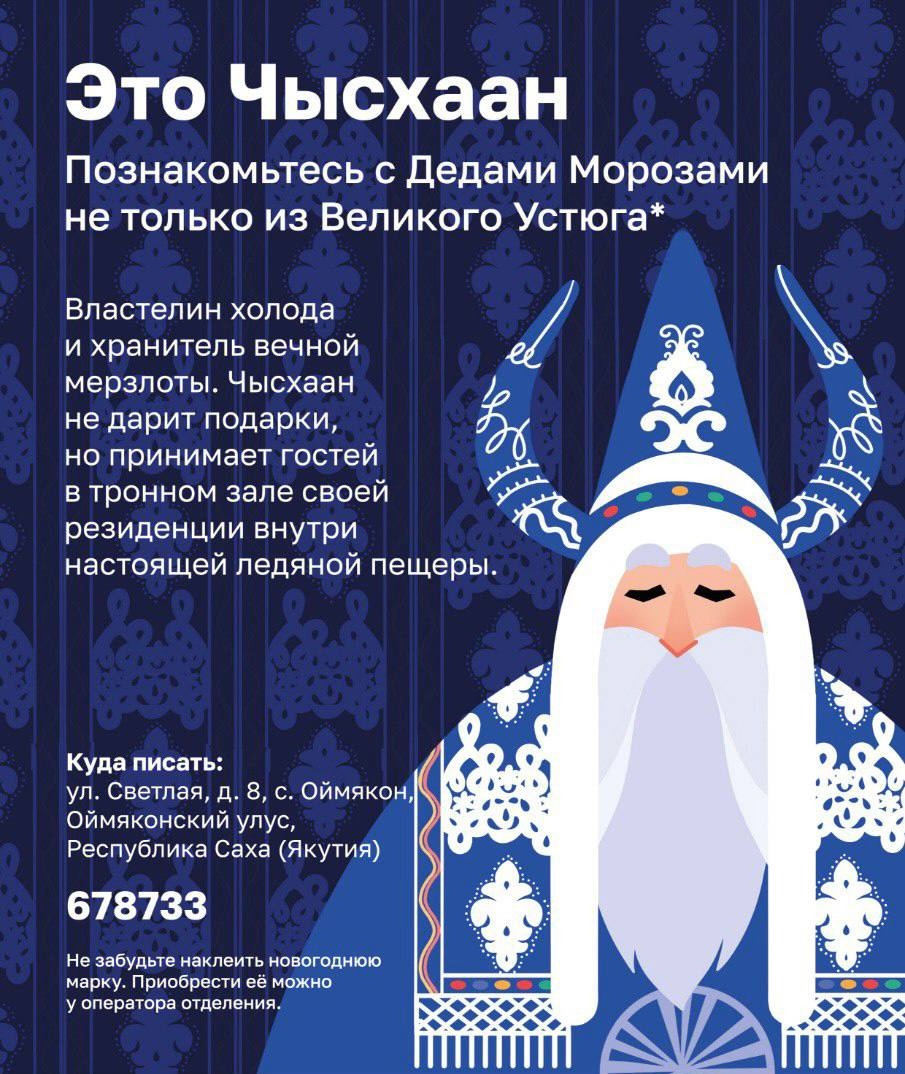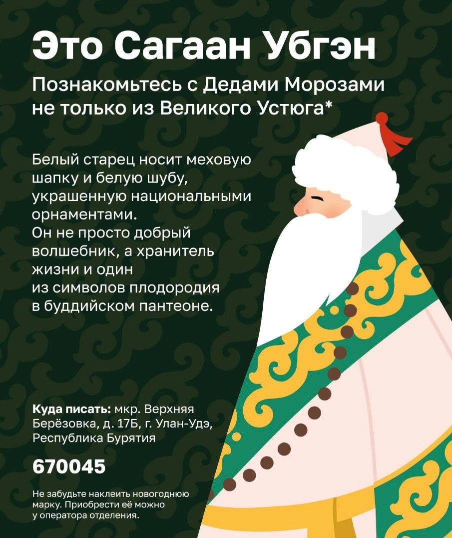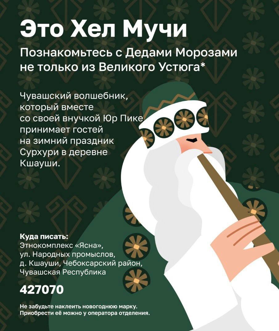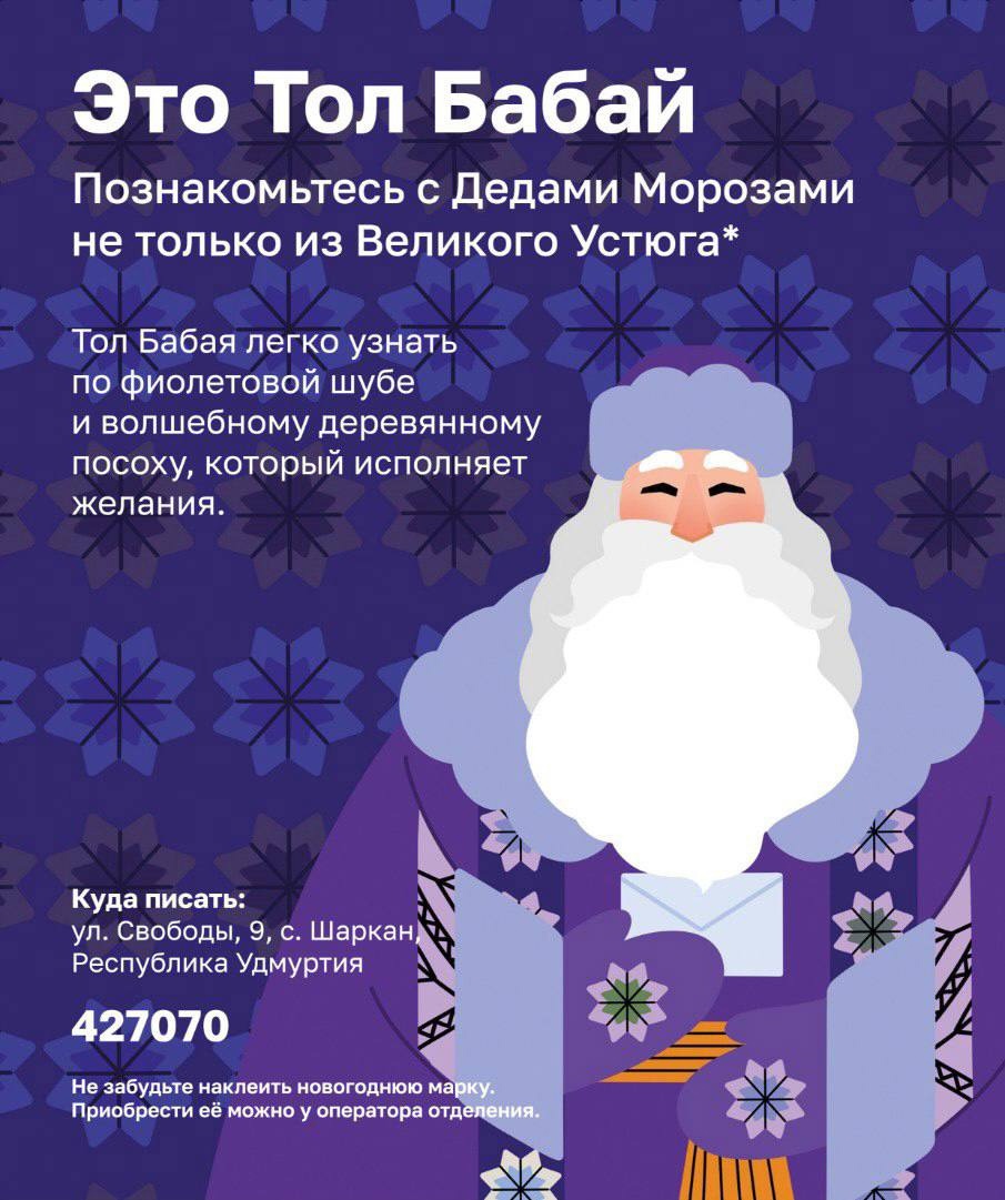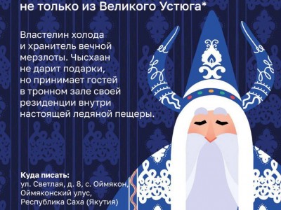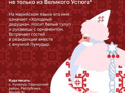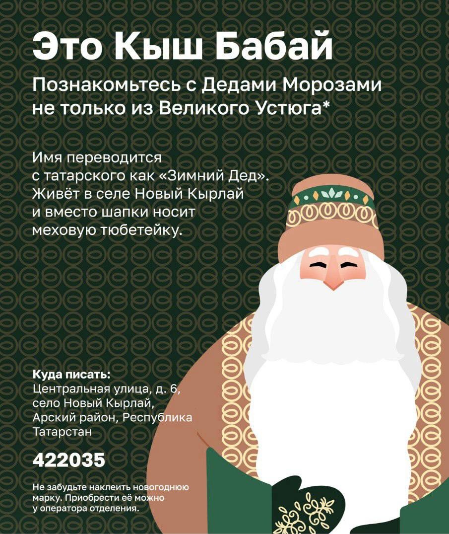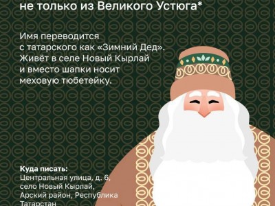 Посланий ждет не только главный волшебник из Великого Устюга, но и его национальные коллеги: Урал Мороз, Ямал Ири, удмуртский дедушка Тол Бабай, чувашский Хел Мучи, марийский Йушто Кугыза, якутский Чысхаан. В Карелии письма направят молодому волшебнику Паккайне, в Татарстане – Кыш Бабаю, в Улан-Удэ – Сааган Убгэну.