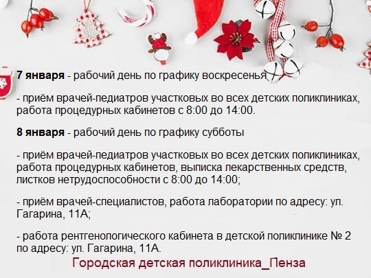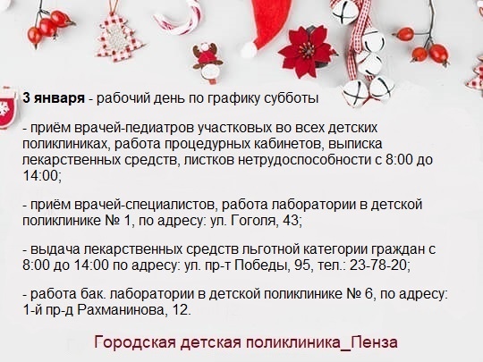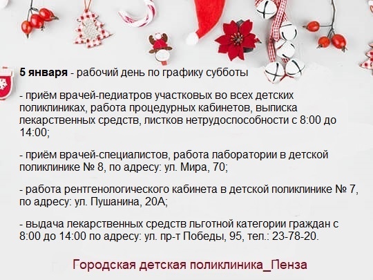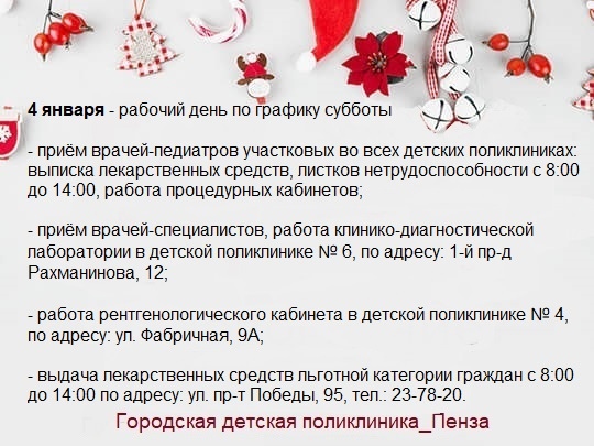 Так, городские детские поликлиники Пензы 30 декабря станут работать по графику субботы. С 8:00 до 14:00 можно будет попасть на прием к педиатру и получить рецепты на лекарства.