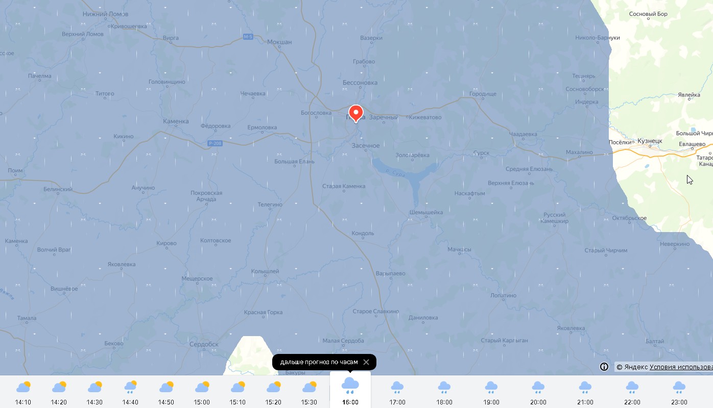 Ожидается, что осадки охватят практически всю территорию региона, за исключением некоторых районов, таких как Кузнецк и Никольск. По прогнозам, дождь закончится только к около полуночи.