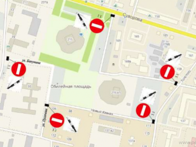 На Юбилейной площади с 22:00 часов 8 мая до 23:00 часов 9 мая нельзя будет проехать по улице Бакунина от улицы Толстого до улицы Суворова; по улице Новый Кавказ от улицы Толстого до улицы Пугачева; по улице Пугачева от улицы Новый Кавказ до улицы Некрасова.