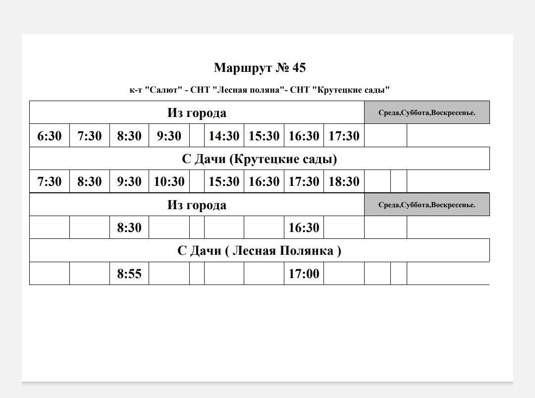 11) Маршрут № 45 (к-т "Салют" -СНТ "Лесная поляна" - СНТ "Крутецкие сады")