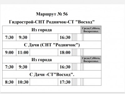 18) Маршрут № 56 (Гидрострой - СНТ "Родничок" – СНТ "Роща" –СТ "Восход")