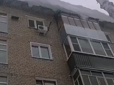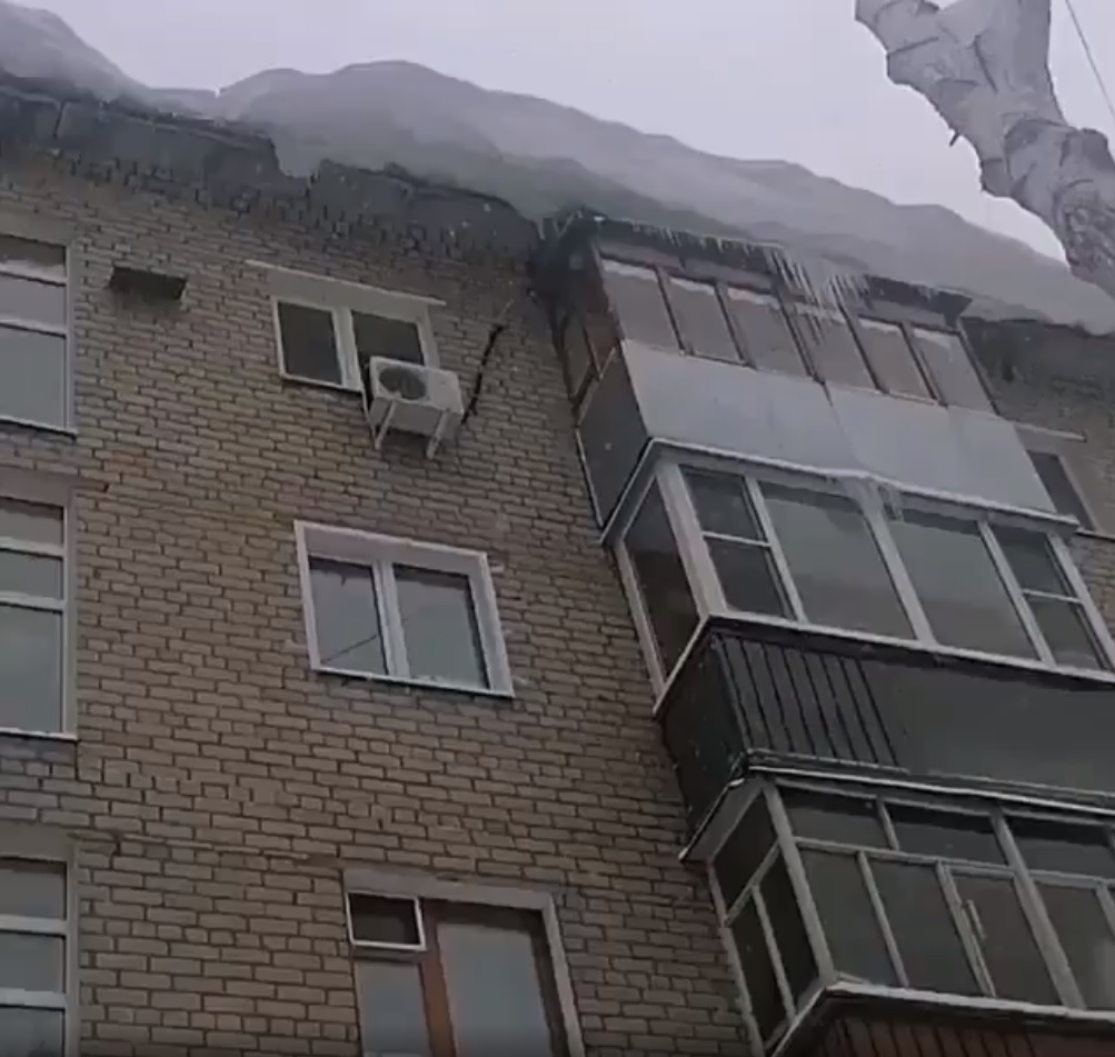 Один из очевидцев опубликовал видео, на котором можно увидеть огромные снежные заносы, свисающие с крыши здания. Помимо снега, дом украсили внушительные сосульки.