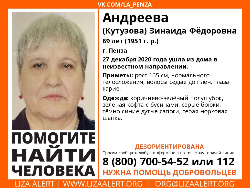 В Пензе пропала 69-летняя Андреева (Кутузова) Зинаида Федоровна. В минувшее воскресенье, 27 декабря, она ушла из дома в неизвестном направлении и не вернулась.