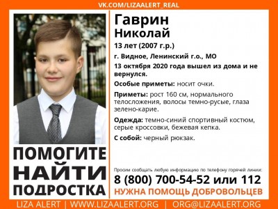 13 октября из дома ушел 13-летний мальчик, обратно он так и не вернулся. Николай Гаврин проживал в городе Видное в Ленинском городском округе Московской области.