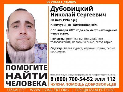 Сегодня, 22 января, пензенские волонтеры из поискового отряда «Лиза Алерт» опубликовали приметы пропавшего 30-летнего Николая Дубовицкого. По словам поисковиков, он может находиться в Пензенской области.